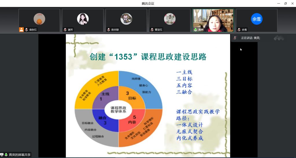 学前教育专业课程思政在项目立项、课程建设、案例获奖、教研室建设方面的发展和形成的链条式成果。然后从“为何?”“何为?”两个角度分享学前教育专业课程思政的背景、内涵和做法。希望专业课程门门有思政、专业教师人人讲育人,教师成为先进思想文化的传播者、学生健康成长的指导者,实现专业引导和价值引领的有机融合。刘小红、蔡红梅、谢梦雪等老师纷纷发言分享自己的感悟、做法与经验,并就所任课程思政问题进行交流。