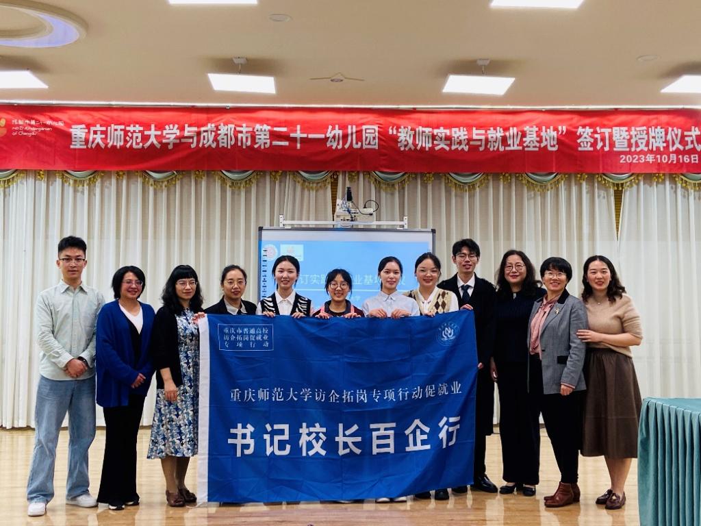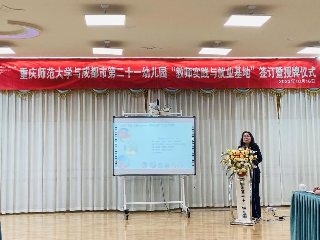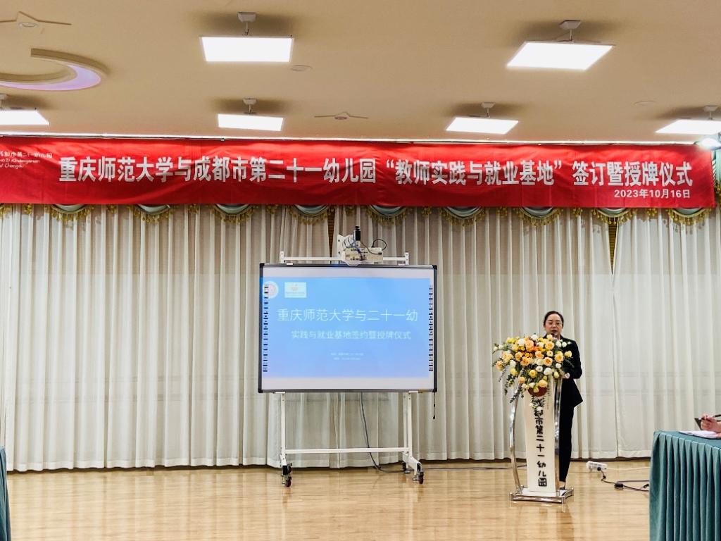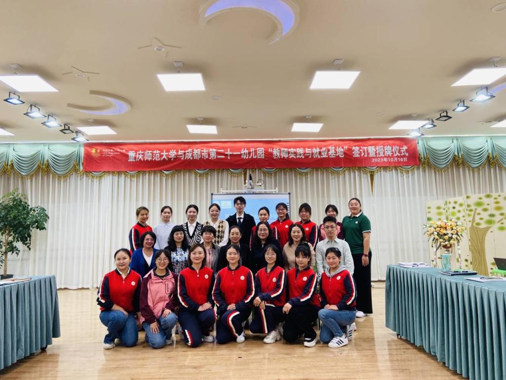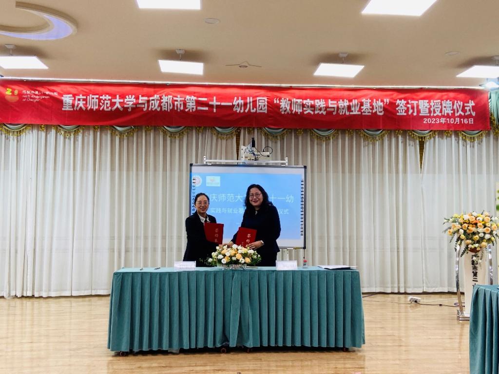 在重庆师范大学师生与成都市第二十一幼儿园教师的共同见证下,院长助理伍雪辉与杨敏园长签订重庆师范大学“实践与就业基地”协议书,并举行了授牌仪式。