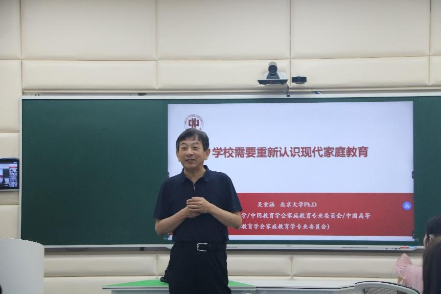 吴重涵教授结合自身丰富的实践经验和研究成果为大家分享了自己对现代家庭教育的见解。吴教授认为,家庭教育的基本问题是“儿童在家庭中是如何改变的”。基于此,他提出家庭教育的实质是家庭生活中儿童的体验性改变、家庭中儿童成长的过程是社会机制和心里机制的统一等十二个命题,并结合具体案例向大家进行性了深入、生动的讲解。