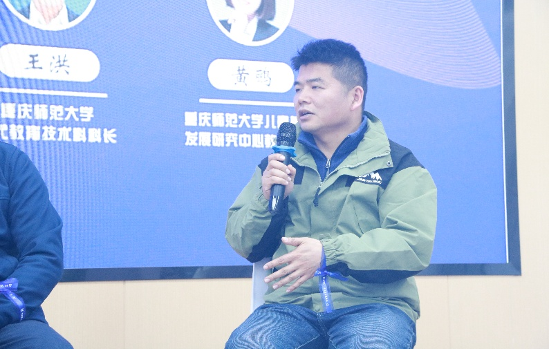 重庆师范大学现代教育技术科科长王洪讲述了重庆师范大学在科技赋能特殊教育方面的贡献。学校现已改造了150间智慧教室和66间智能教室,实现统一平台的信息收集管理,并能通过人工智能、大数据等技术实现对教师和学生的远程指导以及开展教研活动等。