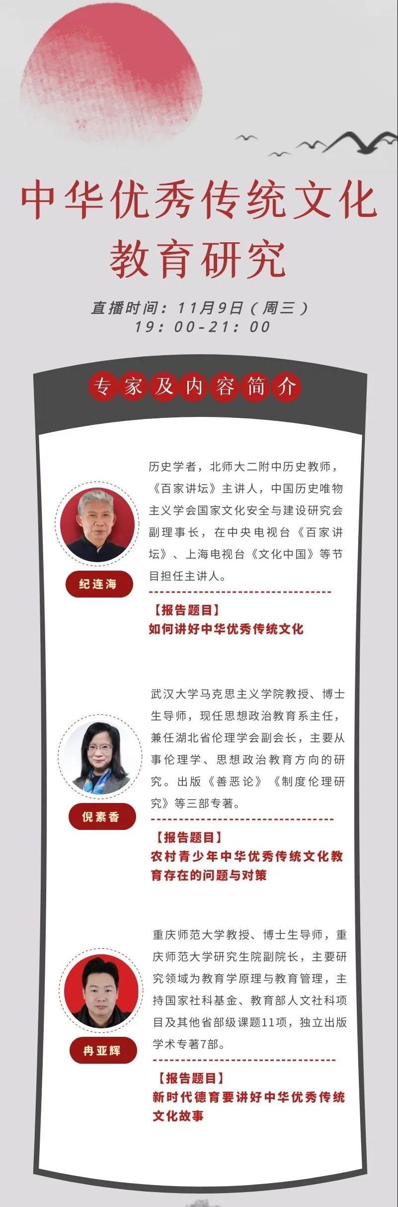 作为新时代的教育工作者,应更加全面深刻地理解和把握中华优秀传统文化传承中的关键问题,不断总结反思中华优秀传统文化教育的做法与经验,为引导学生增强文化自信、讲好中国故事作出贡献。基于此,中国教育科学研究院《中国德育》杂志社“中国德育·明德讲堂”第18期的主题设置为“中华优秀传统文化教育研究”。