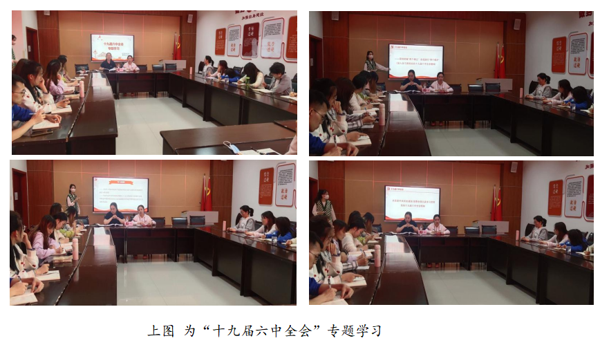 在党的十九届六中全会专题学习会议中,首先由支部书记肖颖同志简介了此次学习提纲,包括关于《中共中央关于党的百年奋斗重大成就和历史经验的决议》的说明、习近平在省部级主要干部学习贯彻党的十九届六中全会精神专题研讨班开班式上发表重要讲话等。