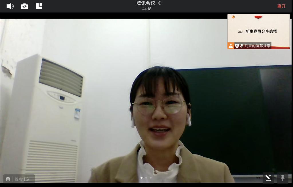 会议共有四项议程:共同观看《南陈北李,相约建党》视频;党支部书记肖颖讲话;新生党员分享感悟;老生党员分享感悟。