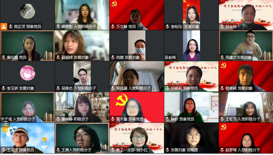 活动伊始,全体成员通过“云见面、云合影”的方式拍照合影,集体观看视频共同深入学习党的二十大报告有关内容,并结合时代背景及教育类专业特色,师生一起共同领会党的二十大精神。
